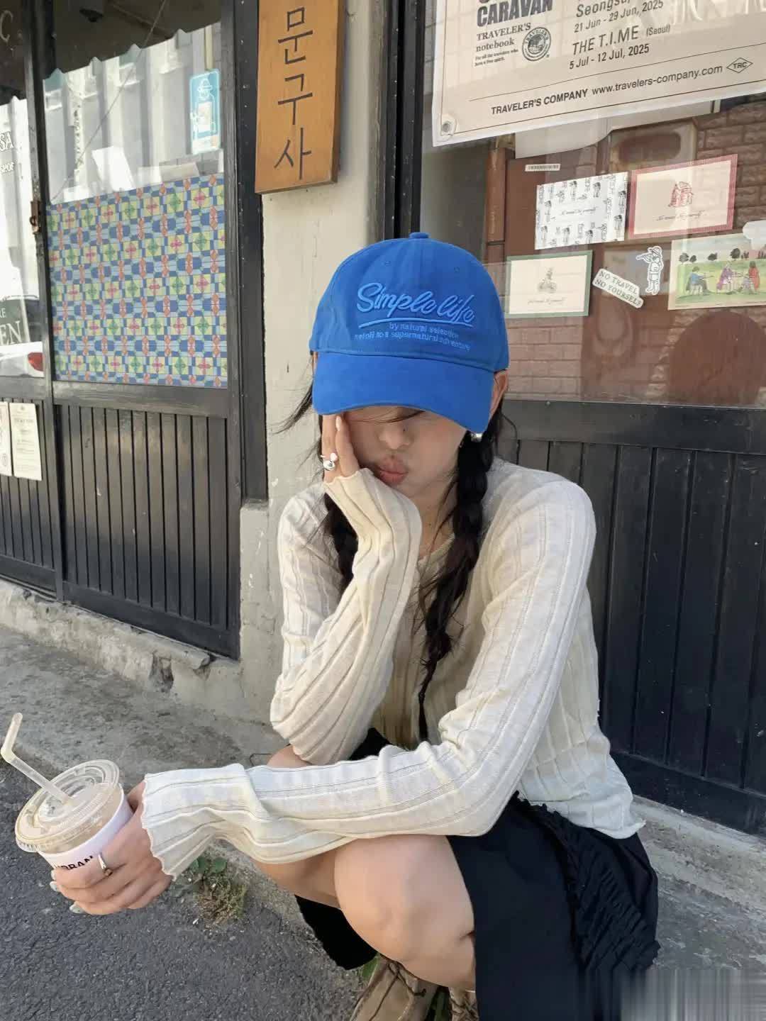 在街道寻一家有特色的小店铺,蹲下来,单手托腮,另一只手拿饮料搭在膝盖上。