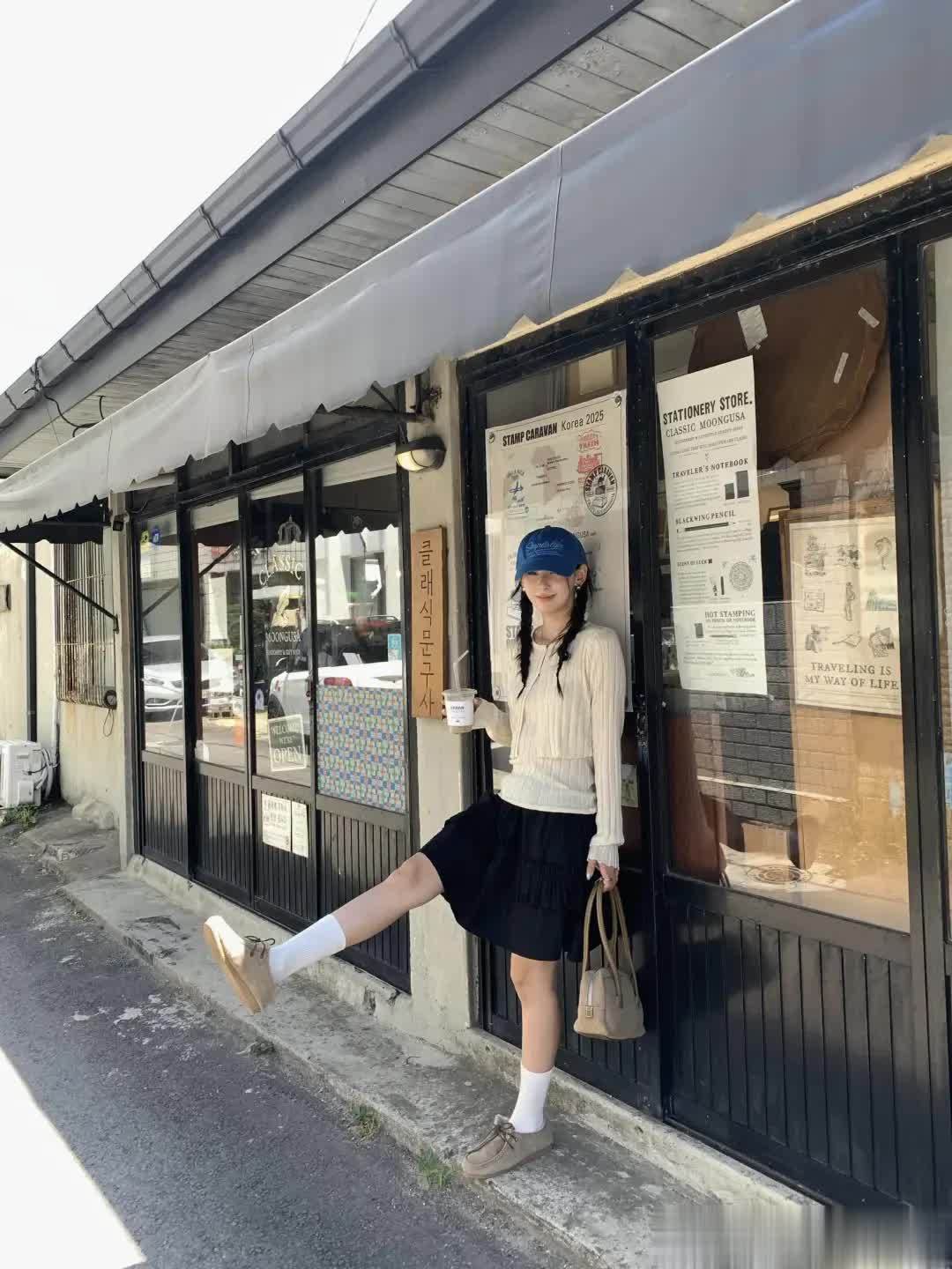 背靠着店铺门窗,手持饮料、包包,低头看地面,或者向前踢起一条腿,拍出的照片有不经意的美感。